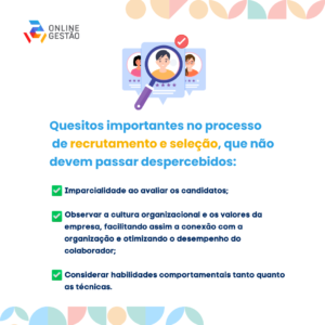 Quesitos importantes no processo de recrutamento e seleção, que não devem passar despercebidos: – Imparcialidade ao avaliar os candidatos; – Observar a cultura organizacional e