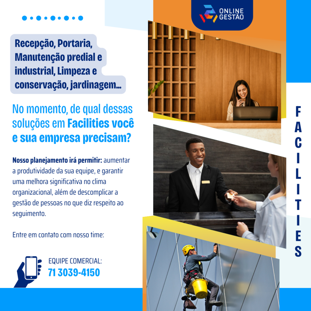 Recepção, Portaria, Manutenção predial e industrial, Limpeza e conservação, jardinagem…