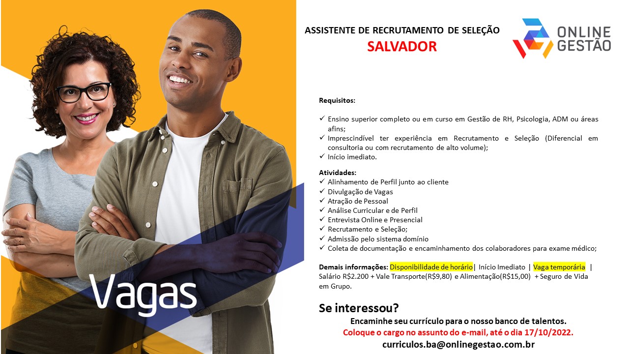 Demais informações: Disponibilidade de horário| Início Imediato | Vaga temporária | Salário R$2.200 + Vale Transporte(R$9,80) e Alimentação(R$15,00) + Seguro de Vida em Grupo.