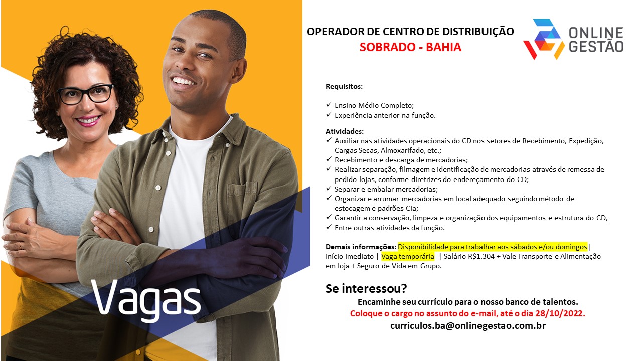 Vaga operador de centro de distribuição – Sobrado Bahia