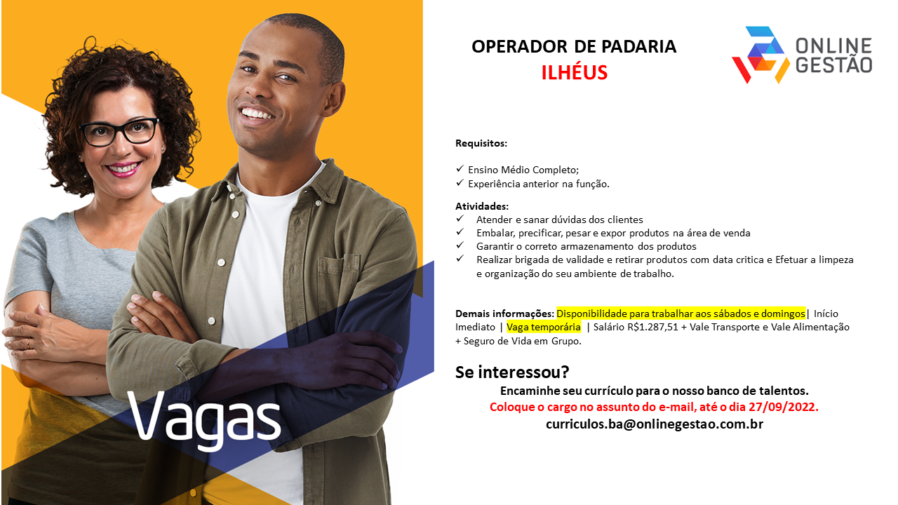 Demais informações: Disponibilidade para trabalhar aos sábados e domingos| Início Imediato | Vaga temporária | Salário R$1.287,51 + Vale Transporte e Vale Alimentação + Seguro de Vida em Grupo.